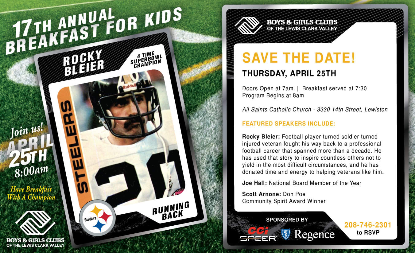 Rocky Bleier will be our featured Speaker – if you don’t know who he is…He is a 4 Time Superbowl Champion with the Pittsburgh Steelers. His story is powerful as he shares the challenges he faced as a war veteran and athlete - you will be inspired by him! Come Have Breakfast with a Champion and help us honor some of our outstanding community members and volunteers. It is sure to be a great morning and we would love to have you there.